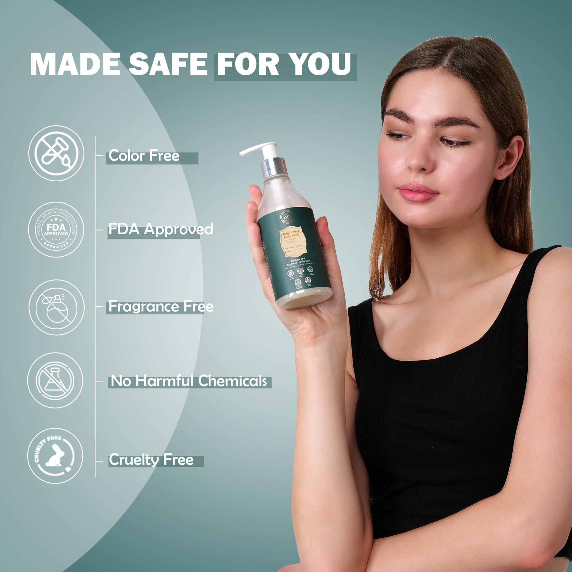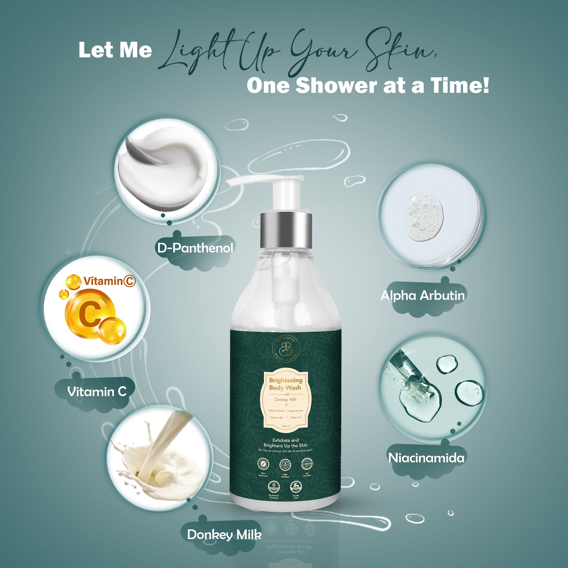 Our body wash is formulated to deeply nourish and hydrate your skin while promoting a brighter, more even complexion. It contains a blend of Donkey Milk, Niacinamide, Alpha Arbutin, Vitamin C, and D-Panthenol, which work together to improve skin elasticity, reduce dark spots, enhance radiance, and soothe irritation.